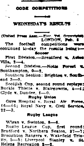 code ooMPrrmoitt WEDNESDAY'S RESULTS (United Pr*« Kun. —Elec. T* O ip* i l|M) LONDON, M>. t The football competition* were continued to-day the reeulta being?— Boooer First Division.—Brentford yl Aston Villa, 2—4. Second Division.—Notts Forest VL Southampton, o—2. Southern Section: Brighton v. Souflkend 3—o. Scottish Cup, second round replay*: Buckie Thistle v. Blairgowrie, 4—l; Clyde v. Dundee, i —o. Rugby Union Guys Hospital v. Royal Air Force, i 6—16; Royal Navy v. Civil Service, 22—3. Rugby League Wigan v. Swinton. B—6. Rugby League Cup, first round: Bradford v. Northern Seaton, 37—7; Broughton Rangers v. Wakefield Trinity. 5 — 5: Liverpool Stanley v. SL Helens Recreation t —2.