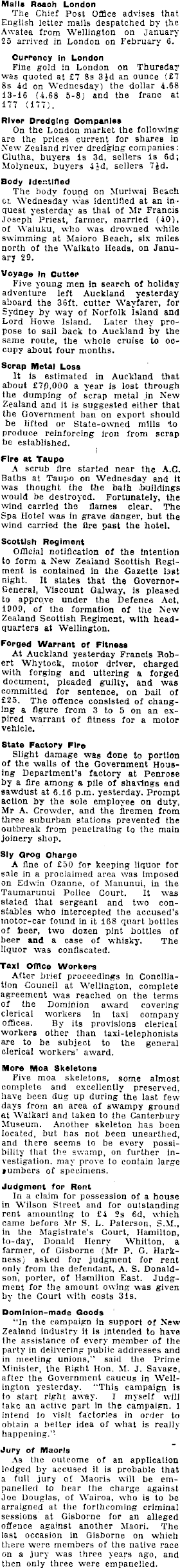Malls Reach London The Chief Post Office advises that English letter mails despatched by the Awatea from Wellington on January 25 arrived in London on February 6. Currency in London Fine gold in London on Thursday was quoted at £7 8s 3£d an ounce (£7 8s 4d on Wednesday) the dollar 4.68 13-16 (4.68 5-8) and the franc at 177 (177). River Dredging Companies On the London market the following are the prices current for shares in New Zealand river dredging companies: Glutha, buyers Is 3d, sellers is 6d; Molyneux, buyers 4id, sellers 7Ad. Body Identified The body found on Muriwai Beach gl Wednesday was identified at an inquest yesterday as that of Mr Francis Joseph Priest, farmer, married (40), of Waiuku, who was drowned while swimming at Maioro Beach, six miles north of the Waikato Heads, on January 29. Voyage In Cutter Five young men in search of holiday adventure left Auckland yesterday aboard the 36ft. cutter Wayfarer, for Sydney by way of Norfolk Island and Lord Howe Island. Later they propose to sail back to Auckland by the same route, the whole cruise to occupy about four months. Scrap Metal Loss It is estimated in Auckland that about £70,000 a year is lost through the dumping of scrap metal in New Zealand and it is suggested either that the Government ban on export should be lifted or State-owned mills to produce reinforcing iron from scrap be established. Fire at Taupo A scrub Ore started near the A.C. Baths at Taupo on Wednesday and it was thought the the bath buildings would be destroyed. Fortunately, the wind carried the flames clear. The Spa Hotel was in grave danger, but the wind carried the fire past the hotel. Scottish Regiment Official notification of the intention to form a New Zealand Scottish Regiment is contained in the Gazette last night. It states that the GovernorGeneral, Viscount Galway, is pleased to approve under the Defence Act, 1909, of the formation of the New Zealand Scottish Regiment, with headquarters at Wellington. Forged Warrant of Fitness At Auckland yesterday Francis Robert Whytock, motor driver, charged with forging and uttering a forged document, pleaded guilty, and was committed for sentence, on bail of £25. The offence consisted of changing a figure from 3 to 5 on an expired ■warrant of fitness for a motor vehicle. State Factory Fire Slight damage was done to portion of the walls of the Government Housing Department’s factory at Penrose by a fire among a pile of shavings and sawdust at 6.16 p.m. yesterday. Prompt action by the sole employee on duty, Mr A. Crowder, and the firemen from three suburban stations prevented the outbreak from penetrating to the main joinery shop. Sly Grog Charge A fine of £SO for keeping liquor for sale in a proclaimed area was imposed on Edwin Ozanne, of Manunui, in the Taumarunui Police Court. It was stated that sergeant and two constables who intercepted the accused’s motor-car found in it 108 quart bottles of beer, two dozen pint bottles of beer and a case of whisky. The liquor was confiscated. Taxi Office Workers After brief proceedings In Conciliation Council at Wellington, complete agreement was reached on the terms of the Dominion award covering clerical workers in taxi company offices. By its provisions clerical workers other than taxi-telephonists are to be subject to the general clerical workers’ award. More Moa Skeletons Five moa skeletons, some almost complete and excellently preserved, have been dug up during the last few days from an area of swampy ground at Waikari and taken to the Canterbury Museum. Another skeleton has been located, but has not been unearthed, and there seems to be every possibility that the swamp, on further investigation. may prove to contain large lumbers of specimens. Judgment for Rent In a claim for possession of a house in Wilson Street and for outstanding rent amounting to £4 2s 6d, which came before Mr S. L. Paterson, S.M., in the Magistrate's Court, Hamilton, to-day, Donald Henry Whitton, a farmer, of Gisborne (Mr P. G. Harkness) asked for judgment for rent only from the defendant, A. S. Donaldson, porter, of Hamilton East. Judgment for the amount, owing was given by the Court with costs 3is. Dominion-made Goods “In the campaign in support of New Zealand industry it is intended to have the assistance of every member of the party in delivering public addresses and in meeting unions,’’ said the Prime Minister, the Right Hon. M. J. Savage, after the Government caucus in Wellington yesterday. “This campaign is to start right away. I myself will take an active part in the campaign. 1 intend to visit factories in order to obtain a better idea of what is really happening/’ Jury of Maoris As the outcome of an application lodged by accused it is probable that a full jury of Maoris will be empanelled to hear the charge against Joe Douglas, of Wairoa, who is to be arraigned at the forthcoming criminal sessions at Gisborne for an alleged offence against another Maori. The last occasion in Gisborne on which there were members of the native race on a jury was three years ago, and then only three were empanelled.