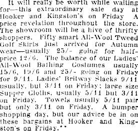 It will really be worth while waiting for—this extraordinary sale day at Hooker and Kingston’s on Friday A price revelation throughout the store. The showroom will he a hive of thrifty shoppers. Fifty smart All-Wool Tweed Golf Skirts just arrived for Autumn wear—usually 25/- going for halfprice 12/6. The balance of our Ladies' All-Wool Bathing Costumes usually 15/6, 19/6 and 25/- going on Friday for 9/ 11. Ladies’ Britwav Slacks 9/11 usually, but 3/11 on Friday: large size Supper Cloths, usually 5/11 but 3/11 on Friday. Towels usually 5/11 pair but only 3/11 on Friday. A bumper shopping day, but our advice be in on these bargains at Hooker and Kingston’s on Friday."