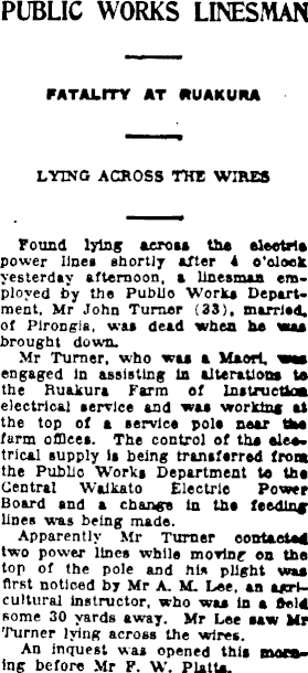 PUBLIC WORKS LINESMAN FATALITY AT RUAKURA LYING ACROSS THE WIRES Found lying Across the electric power lines shortly after 4 o’clock yesterday afternoon, a linesman employed by the Public Works Department, Mr John Turner (33), married, of Pirongia, was dead when he was brought down. Mr Turner, who was a Maori, was engaged In assisting In alterations ta the Ruakura Farm of Instructtoß electrical service and was working at the top of a service pole near the farm offices. The control of the electrical supply Is being transferred from the Public Works Department to the Central Waikato Electric Power Board and a change In the feeding lines was being made. Apparently Mr Turner contacted two power lines while moving on the top of the pole and his plight was first noticed by Mr A. M. Lee, an agricultural instructor, who was in a Held some 30 yards away. Mr Lee saw Mr 'Turner lying across the wires. An inquest was opened this morning before Mr F. W. Platts.