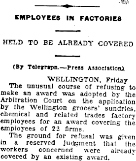 EMPLOYEEB IN FACTORIEB HELD TO BE ALREADY COVERED (By Telegrapn.—Press Association^ WELLINGTON, Friday The unusual course of refusing to make an award was adopted by the Arbitration Court on the application by the Wellington grocers’ sundries, chemical and related trades factory employees for an award covering the employees of 22 firms. The ground for refusal was given in a reserved judgment that the workers concerned were alreadv covered by an existing award.