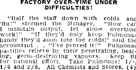 FACTORY OVER-TIME UNDER DIFFICULTIES! “Hair the stair down with colds and ’llu:” stormed tlie Manager. “How can I maintain output, let alone overtime work!” “If they’d only keep Pulmonas handy they’d eoori lose the colds!’ said the accountant . . “I’ve proved it!” Pulmonas pastilles relieve by their penetrating, healing, germ-destroying vapours. Keep lit for national clTort. Take Pulmonas! 1/-, 1/6 and x:/6. All Chemists and Stores, (i)