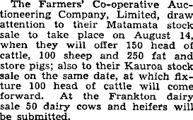 The Farmers’ Co-operative Auctioneering Company, Limited, draw attention to their Matamata stock sale to take place on August 14, when they will offer 150 head of cattle, 100 sheep and 250 fat and store pigs; also to their Kauroa stock sale on the same date, at which fixture 100 head of cattle will come forward. At the Frankton dairy sale 50 dairy cows and heifers will be submitted.