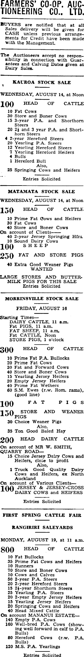FARMERS’ CO-OP. AUCTIONEERING CO.. LTD, BUYERS are notified that at all Sales delivery will be given for CASH unless previous arrangements for Credit have been made with the Management. The Auctioneers accept no responsibility in connection with Guarantees and Calving Dates given at Dairy Sales. KAUROA STOCK SALE WEDNESDAY. AUGUST 14, at Noon 100 HEAD OF CATTLE 10 Fat Cows 30 Store and Boner Cows 15 3-year P.A. and Shorthorn Steers 20 2J and 3 year P.A. and Shorthorn Steers 4 2-year Hereford Steers 20 Yearling P.A. Steers 12 Yearling Hereford Steers 7 Yearling Hereford Heifers 4 Bulls 1 Hereford Bull Also, 25 Springing Cows and Heifers Entries Solicited MATAMATA STOCK SALE WEDNESDAY, AUGUST 14, at Noon HEAD OF CATTLE 10 Prime Fat flows and Heifers 30 Fat Cows 40 Store and Boner Cows On account of Clients 40 2-year Jersey Springing Hfrs. 10 Sound Dairy Cows JQO SHEEP 250 FAT AND STORE PIGS 40 Extra Good Weaner Pigs WANTED LARGE STORES AND BUTTERMILK PIGS FOR THIS SALE Entries Solicited MORRINSVILLE STOCK SALE FRIDAY, AUGUST 16 Starting Times— DAIRY CATTLE, 11 a.m. Fat PIGS, 11 a.m. FAT SHEEP, 11 a.m. Fat CATTLE, Noon STORE PIGS, 1 o’clock 300 HEAD OF CATTLE 10 Prime Fat P.A. Bullocks 20 Prime Fat Cows 30 Fat and Forward Cows 40 Store and Boner Cows 15 Yearling Jersey Heifers 20 Empty Jersey Heifers 40 Prime Fat Wethers 60 S.M. Ewes (r.w. Rom. rams), (good line) 100 FAT PIGS 1 -(1 STORE AND WEANER -*-* >V PIGS 30 Choice Weaner Pigs Also, 35 Ton Good Baled Hay 200 HEAD DAIRY CATTLE On account of MR W. SMITH, QUARRY ROAD--15 Choice Jersey Dairy Cows and Heifers, close to profit Also, 1 Truck Good Quality Dairy Cows and Heifers, ex North Auckland On account of Various Clients—--100 JERSEY & JERSEY-CROSS V DAIRY COWS and HEIFERS Entries Solicited FIRST SPRING CATTLE FAIR RANGIRIRI SALEYARDS MONDAY, AUGUST 19, at 11 a.m. 800 HEAD OF CATTLE 10 Fat Bullocks 35 Prime Fat Cows and Heifers 10 Runners 70 Store and Boner Cows 10 Cows and Calves 50 2-year P.A. Steers 20 2-year Hereford Steers 15 2J-year Shorthorn Steers 25 Yearling P.A. Steers 20 2-year Empty Jersey Heifers 15 Yearling Jersey Heifers 20 Springing Cows and Heifers 40 Head Mixed' Cattle On account MANANUI ESTATE--140 Empty P.A. Cows 160 Well-bred P.A. Cows (showing well forward in calf to P.A. Bulls) 80 Hereford Cows (r.w. P.A. Bulls) 120 M.S. P.A. Yearlings Entries Solicited