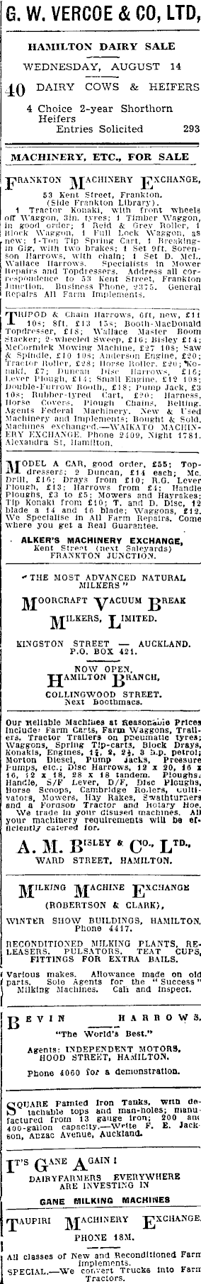 G. W. VERCOE & CO, LTD, HAMILTON DAIRY SALE WEDNESDAY, AUGUST 14 _J_Q DAIRY COWS & HEIFERS 4 Choice 2-year Shorthorn. Heifers Entries Solicited 293 MACHINERY, ETC., FOR SALE RANK TON jyjACHINERY J^XCHANGE, 53 Kent Street, Frankton. (Side Frankton Library). 1 Tractor Konaki, with front wheels off waggon, 3in. tyres; 1 Timber Waggon, in good order; 1 Reid & Grey Roller, 1 I Block Waggon, 1 Full Lock Waggon, as new; 1-Ton Tip Spring- Cart, 1 Breakingin Gig, with two brakes; l Set Oft. Sorenson narrows, with chain; 1 Set D. McL. Wallace Harrows. Specialists in Mower Repairs and Topdressers. Address all correspondence to 5 3 Kent Street, Frankton Junction. Business Phone, 23T5. General Repairs All Farm Implements. TRIPOD .v chain Harrows, Oft, now, £ll 10s; srt. £l3 ir»s; Booth-MacDonald Topdresser, £l s; Wallace .Master Boom Stacker; 2-wheeled Sweep, £10; Bisley £l4; McGorndek Mowing- Machine, £27 iOS; Saw & Spindle, £lO K)s; Anderson Engine, £2O; Tractor Roller, £2B; Horse Roller. £2ii;,k'onakl. £7; Duncan Disc Harrows, £l6; Lever Plough, £l i; Small Engine, £l2 10S; Double-Furrow Booth,, £18; Pump Jack, £3 10s ; Rubber-tyred Cart, £2O; Harness, Horse Covers, Plough Chains, Belting. Agents Federal Machinery. New & Used Machinery and Implements; Bought Sold. Machines exchanged.—WAlKATO MACHINERY EXCHANGE. Phone 24 09, Night 1781. Alexandra St, Hamilton. MODEL A CAR, good order, £55; Topdressers; 2 Duncan, £l4 each; Me. Drill, £l6; Drays from £10; R.G. Lever Plough, £l3; Harrows from £4; Handle Ploughs, £3 to £5; Mowers and Hayrakes; Tip Konaki rrom £10; T. and D. Disc, 12 blade a 14 and 16 blade; Waggons, £l2. We Specialise In All Farm Repairs. Come where you get a Real Guarantee. ALKER’S MACHINERY EXCHANGE, Kent Street (next Saleyards) FRANKTON JUNCTION. -THE MOST ADVANCED NATURAL MILKERS ” jyjOORCRAFT JgREAK JMMITED. KINGSTON STREET AUCKLAND. P.O. BOX 421. NOW OPEN, JJAMILTON RANCH, COLLINGWOOD STREET. Next Boothmacs. Our nellable Machines at Reasonable Prices Include- Farm Carts, Farm Waggons, Trailers. Tractor Trailers on pneumatic tyres; Waggons, Spring Tlp-cart3, Block Drays, Konakls, Engines, I|, 2,2 s, 3 hup. petrol; Morton Diesel, Pump jacks, Pressure Pumps, etc.; Disc Harrows, 12 x 20, 16 x 16, 12 x 18, 28 x 18 tandem. Ploughs.Handle, S/K Lever, D/F, Disc Ploughs, Horse Scoops, Cambridge Ro.lers, cultivators, Mowers, Hay Rakes, Swathtumers and a Forason Tractor and Rotary Hoe. We trade In your disused machines. All your machinery requirements will be efficiently catered for. A. M. B I3LEY s C° - LTDWARD STREET. HAMILTON. JJILKING M A CHINE E XCHANGE (ROBERTSON & CLARK), WINTER SHOW BUILDINGS, HAMILTON. Phone 4417. RECONDITIONED MILKING PLANTS, RELEASERS, PULSATORS, TEAT CUPS. FITTINGS FOR EXTRA BAILS. f Various makes. Allowance made on old ( parts. Sole Agents for the “ Success ” 1 Milking Machines. Cali and Inspect. B E V I N HARROWS, “The World’s Best.” Agents: INDEPENDENT MOTORS, HOOD STREET, HAMILTON. Phone 4060 for a demonstration. QUARE F’axnted Iron Tanks, with detachable tops and man-holes; manuctured from 13 gauge Iron; 200 ant. 0 -gallon capacity.—W p *.te F. E. Jack -ganuil Anzac Avenue, Auckland. GJANE 1 DAIBYFARMERS EVERYWHERE ARE INVESTING IN GAME MILKING MACHINES IAUPIRI jyjACHINERY jgXCHANGE. PHONE 18M. All classes of New and Reconditioned Farm implements. SPECIAL.—We convert Trucks Into Farm Tractors.