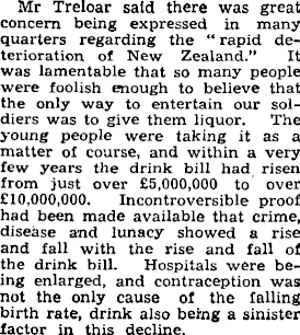 Mr Treloar said there was great concern being expressed in many quarters regarding the “ rapid deterioration of New Zealand.” It was lamentable that so many people were foolish enough to believe that the only way to entertain our soldiers was to give them liquor. The young people were taking it as a matter of course, and within a very few years the drink bill had risen from just over £5,000,000 to over £10,000,000. Incontroversible proof had been made available that crime, disease and lunacy showed a rise and fall with the rise and fall of the drink bill. Hospitals were being enlarged, and contraception was not the only cause of the falling birth rate, drink also being a sinister factor in this decline.