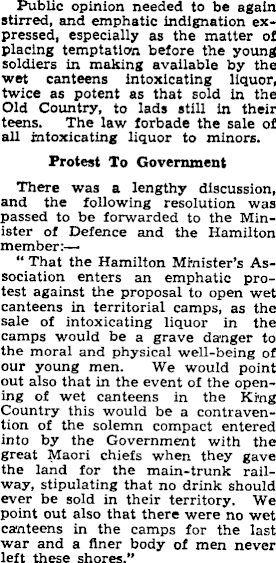 Public opinion needed to be again stirred, and emphatic indignation expressed, especially as the matter of placing temptation before the young soldiers in making available by the wet canteens intoxicating liquor, twice as potent as that sold in the Old Country, to lads still in their teens. The law forbade the sale of all intoxicating liquor to minors. Protest To Government There was a lengthy discussion, and the following resolution was passed to be forwarded to the Minister of Defence and the Hamilton member:—■ “ That the Hamilton Minister's Association enters an emphatic protest against the proposal to open wet canteens in territorial camps, as the sale of intoxicating liquor in the camps would be a grave danger to the moral and physical well-being of our young men. We would point out also that in the event of the opening of wet canteens in the King Country this would be a contravention of the solemn compact entered into by the Government with the great Maori chiefs when they gave the land for the main-trunk railway, stipulating that no drink should ever be sold in their territory. We point out also that there were no wet canteens in the camps for the last war and a finer body of men never left these shores.”