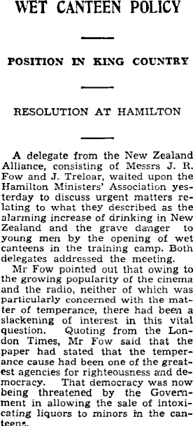 WET CANTEEN POLICY POSITION IN KING COUNTRY RESOLUTION AT HAMILTON A delegate from the New Zealand Alliance, consisting of Messrs J. R. Fow and J. Treloar, waited upon the Hamilton Ministers’ Association yesterday to discuss urgent matters relating to what they described as the alarming increase of drinking in New Zealand and the grave danger to young men by the opening of wet canteens in the training camp. Both delegates addressed the meeting. Mr Fow pointed out that owing to the growing popularity of the cinema and the radio, neither of which was particularly concerned with the matter of temperance, there had been a slackening of interest in this vital question. Quoting from the London Times, Mr Fow said that the paper had stated that the temperance cause had been one of the greatest agencies for righteousness and democracy. That democracy was now being threatened by the Government in allowing the sale of intoxicating liquors to minors in the canteens.