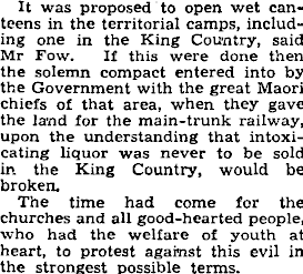 It was proposed to open wet canteens in the territorial camps, including one in the King Country, said Mr Fow. If this were done then the solemn compact entered into by the Government with the great Maori chiefs of that area, when they gave the land for the main-trunk railway, upon the understanding that intoxicating liquor was never to be sold in the King Country, would be broken. The time had come for the churches and all good-hearted people, who had the welfare of youth at heart, to protest against this evil in the strongest possible terms.