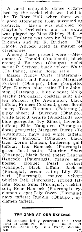 A most enjoyable dance organI ised by the social club was held in j the Te Rore Hall, when there was a good attendance from surrounding districts. Music was supplied by | Clayton's Orchestra, and an extra I was played by Miss Shirley Bell. A [novelty dance was won by Miss Tess Brennan and Mr R. Bridson. Mr Harold Allcock acted as master of ceremonies. Among those present were:—Mesdames A. Donald (Auckland), black crepe; J. Burrows (Ohaupo), violet satin; P. Scriven. black velvet; Waite (Te Pahu). cream floral satin. Misses Nancy Curts (Paterangi), black skirt and floral top; Margaret Forkert (Ohaupo), blue georgette; Wyn Duncan, blue satin; Elbe Johnston (Paterangi), blue cloque; Molly Macky (Pirongia), cocktail suit; Eillen Forkert (Te Awamutu), black taffeta; Frances Coxhead, green floral ’sheer; Tess Brennan (Paterangi), !gipsy sheer; J. Burrows (Ohaupo), [white lace; J. Graife (Auckland), sky [blue georgette; Ivy Sifleet, lavender i taffeta; Ellie Naughten (Pirongia), [floral georgette; Margaret Burns (Te Awamutu), navy and white taffeta; ■ Bonnie Forkert, (Ohaupo), black [lace; Lorna Duncan, buttercup gold taffeta; Iris Hancock (Paterangi). I green floral satin; Maurine Shaw (Ohaupo), black floral sheer; Laurna Hancock (Paterangi), mauve embossed cloque; Pearl Forkert (Ohaupo), black taffeta; Jackson (Pirongia), cream satin; Lily Silvert (Paterangi), mauve velvet; Shirley Bell (Pirongia), striped taffeta; Mona Sims (Pirongia), cocktail suit; Rene Hancock (Paterangi), cyclamen crepe; Lily Owen (Pirongia), navy taffeta; Rudkin (Ohaupo), cyclamen taffeta. TRY ZANN AT OUR EXPENSE 9(1 stamps bring- generous trial treat OIPM or Zaun Pile Kenedy. .-linple tr Jeetive.—Zarm fity.. Box PstfE. Welling "n. (7;