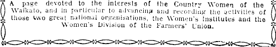 X A pnge devoted to the interests of the Country Women of the (j Waikato, and in particular to advancing and recording the activities of (j X those Awo great national organisations, the Women's Institutes and the V Women s Division of the Farmers’ Union.