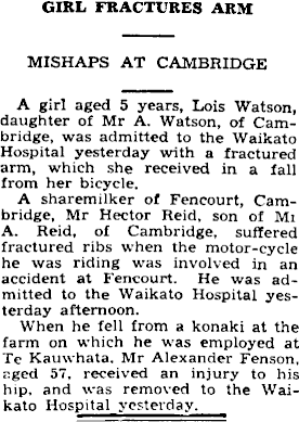 GIRL FRACTURES ARM MISHAPS AT CAMBRIDGE A girl aged 5 years, Lois Watson, daughter of Mr A. Watson, of Cambridge, was admitted to the Waikato Hospital yesterday with a fractured arm, which she received in a fall from her bicycle. A sharemilker of Fencourt, Cambridge, Mr Hector Reid, son of Mi A. Reid, of Cambridge, suffered fractured ribs when the motor-cycle he was riding was involved in an accident at Fencourt. He was admitted to the Waikato Hospital yesterday afternoon. When he fell from a konaki at the farm on which he was employed at Tc Kauwhata. Mr Alexander Fenson, aged 57. received an injury to his hip, and was removed to the Waikato Hospital yesterday.
