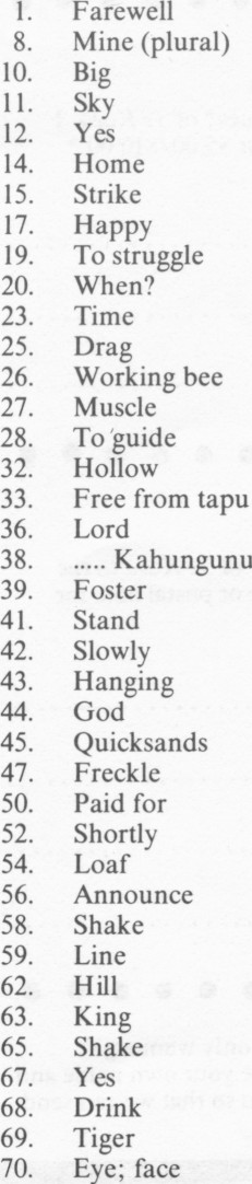 1. Farewell 8. Mine (plural) 10. Big 11. Sky 12. Yes 14. Home 15. Strike 17. Happy 19. To struggle 20. When? 23. Time 25. Drag 26. Working bee 27. Muscle 28. To guide 32. Hollow 33. Free from tapu 36. Lord 38 Kahungunu 39. Foster 41. Stand 42. Slowly 43. Hanging 44. God 45. Quicksands 47. Freckle 50. Paid for 52. Shortly 54. Loaf 56. Announce 58. Shake 59. Line 62. Hill 63. King 65. Shake 67. Yes 68. Drink 69. Tiger 70. Eye; face