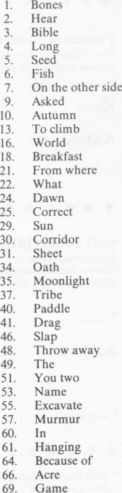 1. Bones 2. Hear 3. Bible 4. Long 5. Seed 6. Fish 7. On the other side 9. Asked 10. Autumn 13. To climb 16. World 18. Breakfast 21. From where 22. What 24. Dawn 25. Correct 29. Sun 30. Corridor 31. Sheet 34. Oath 35. Moonlight 37. Tribe 40. Paddle 41. Drag 46. Slap 48. Throw away 49. The 51. You two 53. Name 55. Excavate 57. Murmur 60. In 61. Hanging 64. Because of 66. Acre 69. Game