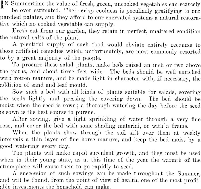 1 N Summertime the value of fresh, green, uncooked vegetables can scarcely be over estimated. Their crisp coolness is peculiarly gratifying to our parched palates, and they afford to our enervated systems a natural restorative which no cooked vegetable can supply. Fresh cut from our garden, they retain in perfect, unaltered condition the natural salts of the plant. A plentiful supply of such food would obviate entirely recourse to those artificial remedies which, unfortunately, are most commonly resorted to by a great majority of the people. To procure these salad plants, make beds raised an inch or two above the paths, and about three feet wide. The beds should be well enriched with rotten manure, and be made light in character with, if necessary, the addition of sand and leaf mould. Sow such a bed with all kinds of plants suitable for salads, covering the seeds lightly and pressing the covering down. The bed should be moist when the seed is sown; a thorough watering the day before the seed is sown is the best course to pursue. After sowing, give a light sprinkling of water through a very fine rose, and cover the bed with some shading material, or with* a frame. When the plants show through the soil sift over them at weekly intervals a thin layer of fine horse manure, and keep the bed moist by a good watering every day. The plants will make rapid succulent growth, and they must be used when in their young state, as at this time of the year the warmth of the atmosphere will cause them to go rapidly to seed. A succession of such sowings can be made throughout the Summer, and will be found, from the point of view of health, one of the most profitable investments the household can make.