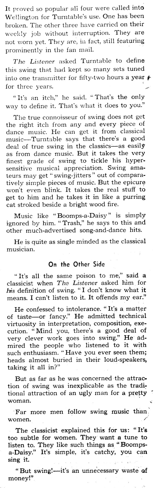 It proved so popular ali four were called into Wellington for Turntable’s use. One has been broken, The other three have carried on their weekly job without interruption. They are not worn yet. They are, in fact, still featuring prominently in the fan mail. = aa The Listener asked Turntable to define this swing that had kept so many sets tuned into one transmitter for fifty-two hours a year fe for three years. we "It’s an itch," he-said. "That's. the only way to define it. That’s what it does to you." The true connoisseur of swing does not get the right itch from any and every piece of dance music. He can get it from classical music-Turntable says that there’s a good deal of true swing in the classics-as easily as from dance music. But it takes the very finest grade of swing to tickle ‘his hypersensitive musical appreciation. Swing amateurs may get "swing-jitters" out of comparatively simple pieces of music. But the epicure won't even blink. It takes the real stuff to get to him and he takes it in like.a purring cat stroked beside a bright wood fire. Music like "Boomps-a-Daisy" is simply ignored by him. "Trash," he says to this and other much-advertised song-and-dance hits. He is quite as single minded as the classical musician. On the Other Side "It’s all the same poison to me," said a classicist when The Listener asked him. for his definition of swing. "I don’t know what it means. I can’t listen to it. It offends my ear." He confessed to intolerance. "It’s a matter of taste-or fancy." He admitted technical virtuosity in interpretation, composition, execution. "Mind you, there’s a good deal of very clever work goes into swing." He admired the people who listened to it with such enthusiasm. "Have you ever seen them; heads almost buried in their Pees taking it all in?" — But as far as he was. anal the attraction of swing was inexplicable as the traditional attraction of an ugly man for a pretty ' woman, wi ‘Far more men follow swing music than. women, _ oN _ The classicist- explained this for us: "It’s too subtle for women. They want a tune to listen to. They like such things as " Boomps-a-Daisy." It’s simple, it’s catchy, you can sing it. : Se "But pase ah an unnecessary waste of money!"
