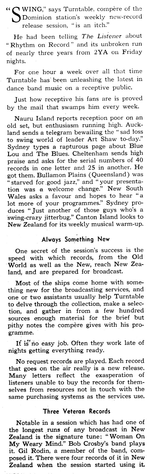 ‘© (XN WING," says Turntable, compére of the Dominion station’s weekly new-record release session, "is an itch." He had been telling The Listener about "Rhythm on Record" and its unbroken run of nearly three years from 2YA on Friday nights. For one hour a week over all that time Turntable has been unleashing the latest in dance band music on a receptive public. Just how receptive his fans are is proved by the mail that swamps him every week. Nauru Island reports reception poor on an old set, but enthusiasm running high. Auckland sends a telegram bewailing the "sad loss to swing world of leader Art Shaw to-day." Sydney types a rapturous page about Blue Lou and The Blues. Cheltenham sends high praise and asks for the serial numbers of 40 records in one letter and 25 in another. He got them. Bullamon Plains (Queensland) was "starved for good jazz," and "your presentation was a welcome change." New South Wales asks a favour and hopes to hear "a lot more of your programmes." Sydney produces "Just another of those guys who’s a ‘swing-crazy jitterbug." Canton Island looks to New Zealand for its weekly musical warm-up. Always Something New One secret of the session’s success is the speed with which records, from the Old ‘World as well as the New, reach New Zea- | land, and are prepared for broadcast. Most of the ships come home with something new for the broadcasting services, and one or two assistants usually help Turntable to delve through the collection, make a selection, and gather in from a few hundred sources enough material for the brief but pithy notes the compére gives with his programme. If i$’no éasy job. Often they work late of nights getting everything ready. No request records are played. Each record that goes on the air really is a new release. Many letters reflect the exasperation of listeners unable to buy the records for themselves from resources not in touch with the same purchasing systems as the services use. Three Veteran Records Notable in a session which has had one of the longest runs of any broadcast in New Zealand is the signature tune: "Woman On My Weary Mind." Bob Crosby’s band plays it. Gil Rodin, a member of the band, composed it. There were four records of it in New Zealand when the session started using it.