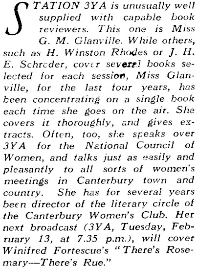 supplied with capable book reviewers. This one is Miss G. M. Glanville. While others, such as H. Winston Rhodes or J. H. E. Schreder, cover sevetel books selected for each session, Miss Glanville, for the last four years, has been concentrating on a single book each time she goes on the air. She covers it thoroughly, and gives extracts. Often, too, she speaks over 3YA for the National Council of Women, and talks just as easily and pleasantly to all sorts of women’s meetings in Canterbury town and country. She has for several years been director of the literary circle of the Canterbury Women’s Club. Her next broadcast (3Y A, Tuesday, February 13, at 7.35 p.m.), will cover Winifred Fortescue’s " There’s Rose-mary-There’s Rue." A TATION 3YA is unusually well