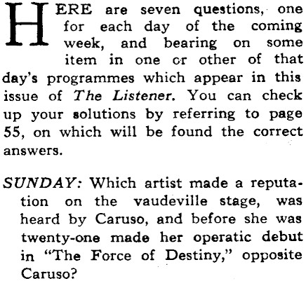 ERE are seven questions, one H for each day of the coming week, and bearing on some item in one or other of that day’s programmes which appear in this issue of The Listener. You can check up your solutions by referring to page 55, on which will be found the correct answers. 2 SUNDAY: Which artist made a reputation on the vaudeville stage, was heard by Caruso, and before she was twenty-one made her operatic debut in "The Force of Destiny," opposite Caruso?