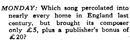 MONDAY: Which song percolated into nearly every home in England last century, but brought its composer only £5, plus a: publisher’s bonus of £20?