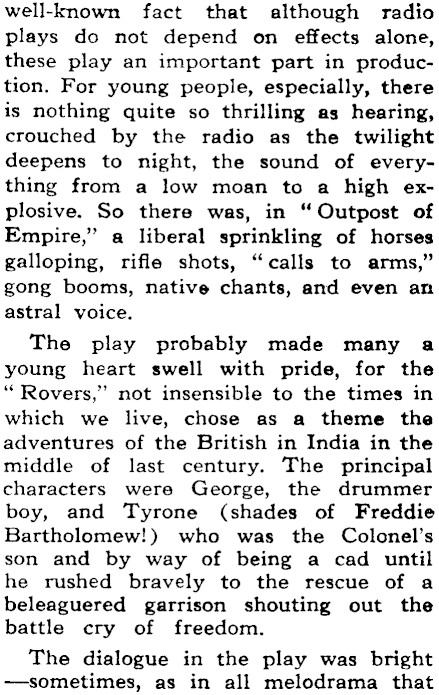 well-known fact that although radio plays do not depend on effects alone, these play an important part in production. For young people, especially, there is nothing quite so thrilling as hearing, crouched by the radio as the twilight deepens to night, the sound of everything from a low moan to a high explosive. So there was, in "Outpost of Empire," a liberal sprinkling of horses galloping, rifle shots, "calls to arms," gong booms, native chants, and even an astral voice. The play probably made many a young. heart swell with pride, for the " Rovers," not insensible to the times in which we live, chose as a theme the adventures of the British in India in the middle of last century. The principal characters were George, the drummer boy, and Tyrone (shades of Freddie Bartholomew!) who was the Colonel’s son and by way of being a cad until he rushed bravely to the rescue of a beleaguered garrison shouting out the battle cry of freedom. The dialogue in the play was bright -sometimes, as in all melodrama that