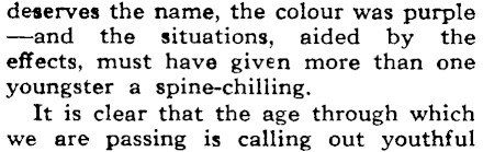 deserves the name, the colour was purple -and the situations, aided by the effects, must have given more than one youngster a spine-chilling. It is clear that the age through which we are passing is calling out youthful