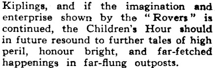 Kiplings, and if the imagination and enterprise shown by the " Rovers" is continued, the Children’s Hour. should in future resound to further tales of high peril, honour bright, and far-fetched happenings in far-flung outposts.
