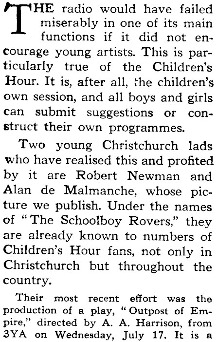 HE radio would have failed miserably in one of its main functions if it did not encourage young artists. This is particularly true of the Children’s Hour. It is, after all, the children’s own session, and all boys and girls can submit suggestions or construct their own programmes. Two young Christchurch lads who have realised this and profited by it are Robert Newman and Alan de Malmanche, whose picture we publish. Under the names of "The Schoolboy Rovers," they are already known to numbers of Children’s Hour fans, not only in Christchurch but throughout the country. Their most recent effort was the production of a play, " Outpost of Empire," directed by A. A. Harrison, from 3YA on Wednesday, July 17. It is a