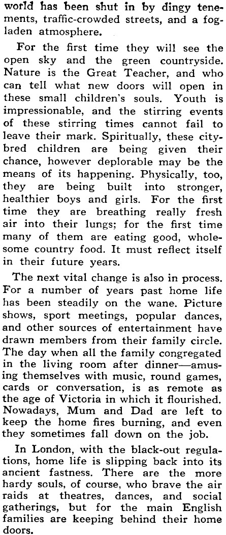 world has been shut in by dingy tenements, traffic-crowded streets, and a fogladen atmosphere. For the first time they will see the open sky and the green countryside. Nature is the Great Teacher, and who can tell what new doors will open in these small children’s souls. Youth is impressionable, and the stirring events of these stirring times cannot fail to leave their mark. Spiritually, these citybred children are being given their chance, however deplorable may be the means of its happening. Physically, too, they are being built into stronger, healthier boys and girls. For the first time they are breathing really fresh air into their lungs; for the first time many of them are eating good, wholesome country food. It must reflect itself in their future years, The next vital change is also in process. For a number of years past home life has been steadily on the wane. Picture shows, sport meetings, popular dances, and other sources of entertainment have drawn members from their family circle. The day when all the family congregated in the living room after dinner-amus-ing themselves with music, round games, cards or conversation, is as remote as the age of Victoria in which it flourished. Nowadays, Mum and Dad are left to keep the home fires burning, and even they sometimes fall down on the job. In London, with the black-out regulations, home life is slipping back into its ancient fastness. There are the more hardy souls, of course, who brave the air raids at theatres, dances, and social gatherings, but for the main English families are keeping behind their home doors.