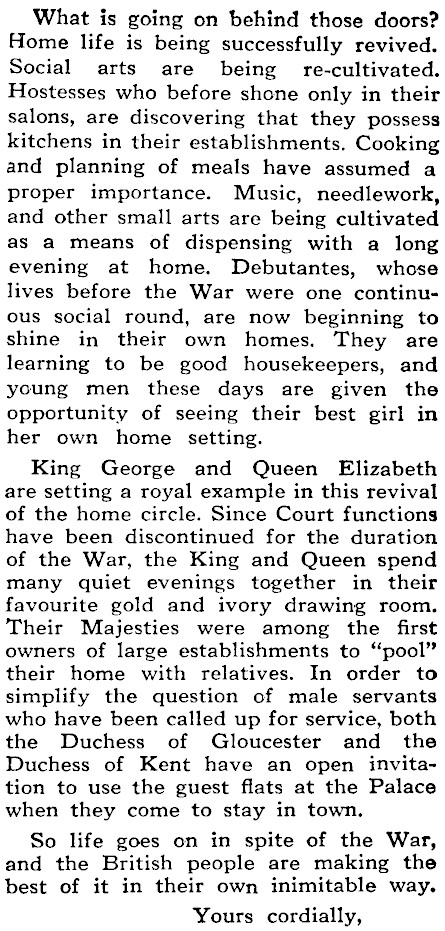 What is going on behind those doors? Home life is being successfully revived. Social arts are being re-cultivated. Hostesses who before shone only in their salons, are discovering that they possess kitchens in their establishments, Cooking and planning of meals have assumed a proper importance. Music, needlework, and other small arts are being cultivated as a means of dispensing with a long evening at home. Debutantes, whose lives before the War were one continuous social round, are now beginning to shine in their own homes. They are learning to be good housekeepers, and young men these days are given the opportunity of seeing their best girl in her own home setting. King George and Queen Elizabeth are setting a royal example in this revival of the home circle. Since Court functions have been discontinued for the duration of the War, the King and Queen spend many quiet evenings together in their favourite gold and ivory drawing room, Their Majesties were among the first owners of large establishments to "pool" their home with relatives. In order to simplify the question of male servants who have been called up for service, both the Duchess of Gloucester and the Duchess of Kent have an open invitation to use the guest flats at the Palace when they come to stay in town. So life goes on in spite of the War, and the British people are making the best of it in their own inimitable way. Yours cordially,
