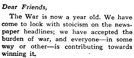 Dear Friends, The War is now a year old. We have come to look with stoicism on the newspaper headlines; we have accepted the burden of war, and everyone-in some way or other-is contributing towards winning it, .
