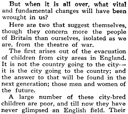 But when it is all over, what. vital and fundamental changes will have been wrought in us? Here are two that suggest themselves, though they concern more the people of Britain than ourselves, isolated as we are, from the theatre of war. The first arises out of the evacuation of children from city areas in England. It is not the country going to the cityit is the city going to the country; and the answer to that will be found in the next generation; those men and women of the future. A large number of these city-bred children are poor, and till now they have never glimpsed an English field. Their