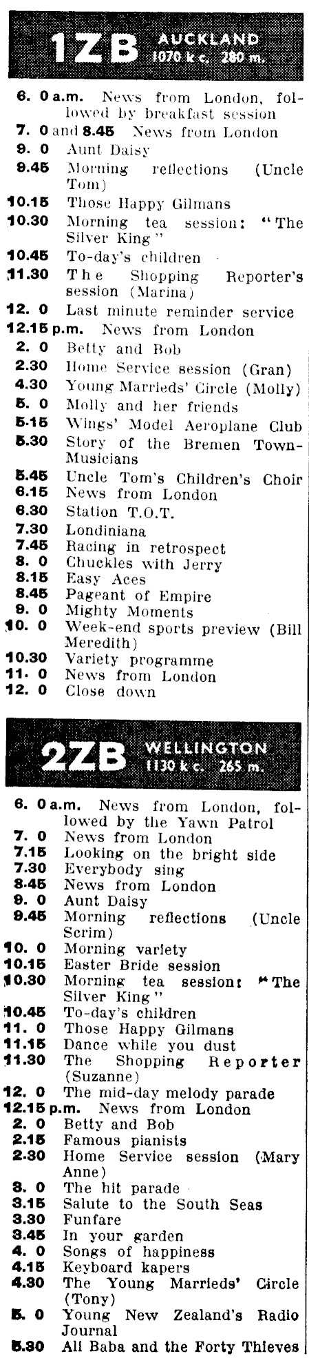 1 ZB cove 200m. 6. Oa.m. News from London, followed by breakfast session 7. Oand 8.45 News from London 9. 0 Aunt Daisy 9.45 Morning reflections (Uncle Tom) 70.16 Those Happy Gilmans 10.30 Morning tea session: ‘The Silver King" 10.45 To-day's children 11.30 The Shopping Reporter's session (Marina) 12. 0 Last minute reminder service 12.15 p.m. News from London 2.0 Betty and Bob 2.30 Home Service session (Gran) 4.30 Young Marrieds’ Circle (Molly) 5. 0 Molly and her friends 5-165 Wings’ Model Aeroplane Club 5.30 Story of the Bremen TownMusicians 5.45 Uncle Tom's Children’s: Choir 6.16 News from London 6.30 Station T.O.T. 7.30 Londiniana 7.45 Racing in retrospect 8.0 Chuckles with Jerry 8.15 Easy Aces 8.45 Pageant of Empire 8. 0 Mighty Moments #0. 0 Week-end sports preview (Bill Meredith) 10.30 Variety programme 41-0 News from London 12. 0 Close down of AF a WELLINGTON {30k c. 265 m. 6, Oa.m. News from London, followed by the Yawn Patrol 7. 0 News from London 7.15 Looking on the bright side 7.30 Everybody sing 8-45 News from London 9.0 Aunt Daisy 8.45 Morning reflections (Uncle Scrim) 970. 0 Morning variety 10.15 Easter Bride session 970.30 Morning tea sessiont "The Silver King" 90.45 To-day’s children 11. 0 Those Happy Gilmans 91.15 Dance while you dust 11.30 The Shopping Reporter (Suzanne) 12. 0 The mid-day melody parade 12.15p.m. News from London 2. 0 Betty and Bob 2.15 Famous pianists 2-30 Home Service session (Mary Anne) 3.0 The hit parade 3.15 Salute to the South Seas 3.30 Funfare 8.45 In your garden 4. 0 Songs of happiness 4.15 Keyboard kapers 4.30 The Young Marrieds’ Circle (Tony) B. 0 Young New Zealand's Radio Journal 6.30 Ali Baba and the Forty Thieves