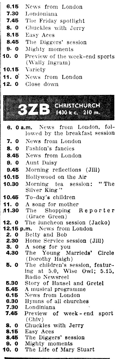 6.15 7.30 7.45 8. 0 8.15 8.45 9. 0 10. 0 10.15 11. 0 12. 0 7. 0 8. 0 8.45 9. 0 9.45 10.15 10.30 10.45 11. 0 1.30 42.0 News from London Londoniana The Friday spotlight Chuckles with Jerry Easy Aces The Diggers’ session Mighty moments Preview of the week-end sports (Wally Ingram)’ Variety News from London Close down Z CHRISTCHURCH 3 (430k c. 210 m. 6. Oa.m. News from London, followed by the breakfast session News from London Fashion’s fancies News from London Aunt Daisy Morning reflections (Jill) Hollywood on the Air Morning tea session: " The Silver King "’ To-day’s children A song for mother The Shopping Reporter (Grace Green) The luncheon session (Jacko) 12.15 p.m. News from London 2. 0 2.30 3. 0 4.30 5.30 5.45 6.15 6.30 7.30 7.45 8. 0 8.15 8.45 9. 0 10. 0 Betty and Bob Home Service session (Jill) A song for you The Young Marrieds’ Circle (Dorothy Haigh) The children’s session, featuring at 5.0, Wise Owl; 5.45, Radio Newsreel Story of Hansel and Gretel A musical programme News from London Hymns of all churches Londiniana ‘ Preview of week-end sport (Chiv) Chuckles with Jerry Easy Aces The Diggers’ session Mighty moments The Life of Mary Stuart