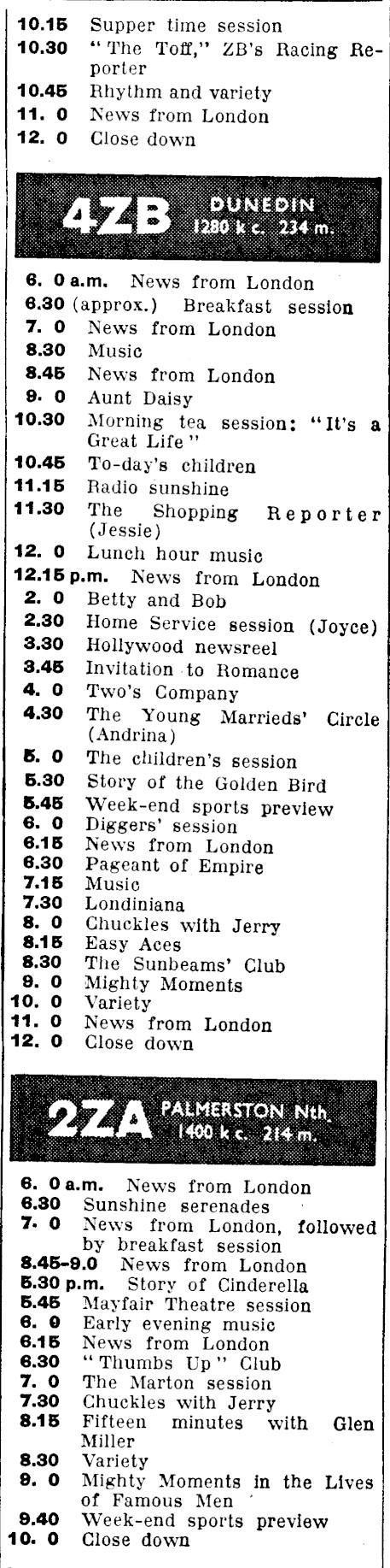 10.15 Supper time session 10.30 "The Toff," ZB’s Racing Reporter 10.45 Rhythm and variety 11. 0 News from London 12. 0 Close down AZB stove v0. 6. Oa.m. News from London 6.30 (approx.) Breakfast session 7. 0 News from London 8.30 Music 8.45 News from London 9-0 Aunt Daisy 10.30 Morning tea session: "It’s a Great Life’’ 10.45 To-day's children 11.15 Radio sunshine 11.30 The Shopping Reporter (Jessie) 12. O Lunch hour music 12.15 p.m. News from London 2. 0 Betty and Bob 2.30 Home Service session (Joyce) 3.30 Hollywood newsreel 3.45 Invitation to Romance 4.0 Two's Company 4.30 The Young Marrieds’ Circle (Andrina) 5. 0 The children’s session 6.30 Story of the Golden Bird 5.45 -Week-end sports preview 6. 0 Diggers’ session 6.16 News from London 6.30 Pageant of Empire 7.15 Music 7.30 Londiniana 8. 0 Chuckles with Jerry 8.15 Easy Aces 8.30 The Sunbeams’ Club 8.0 Mighty Moments 10. 0 Variety 11. 0 News from London 12. O Close down 27 PALMERSTON Nth [400 ke. 214m. 6. Oa.m. News from London 6.30 Sunshine serenades 7-0 News from London, followed by breakfast session 8.45-9.0 News from London 5.30 p.m. Story of Cinderella 5.45 Mayfair Theatre session 6. © Early evening music 6.15 News from London 6.30 ‘‘Thumbs Up" Club 7. 0 The Marton session 7.30 Chuckles with Jerry 8.15 Fifteen minutes with Glen Miller 8.30 Variety 8. 0 Mighty Moments in the Lives of Famous Men ~* 9.40 Week-end sports preview 10. 0 Close down