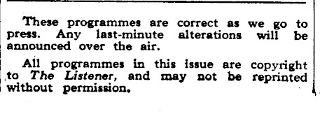These programmes are correct as we go to press. Any last-minute alterations be announced over the air. All programmes in this issue are copyright to The Listener, and may not be reprinted permission, : without