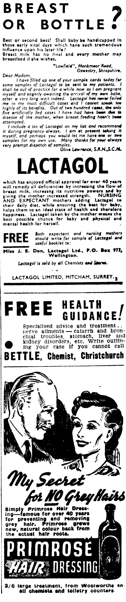 BREAST OR BOTTLE 2 Besc Or second best? Shall baby be handicapped in those early vical days which have such cremendous Influence upon his larer life 7 Breast milk has no rival and every mother May breastfeed if She wishes: "Lowfield" Monkmoor Road, Oswestry , Shropshire Dear Madam, have filled UP one of Your sample cards today for some samples of Lactagol to 'be Kent t0 Ty patients. shall be out of practice 'for 0 while now aS am pregnant myself and eagerly awaiting the arrival of my Own babe after a yery long wait indeed. Lactagol 'has nevet 'failed me in my most difficult cases and cannot spcak t0o highly 0f is benefits. Out of two hundred cass die oaly five artificially fed cases have had have been due 0 disease of the mother, when breast feeding hosn't beta attempted. include tin of Lactagol on my list and recommend ic during pregnancy always. am at present taking i myself; and perhaps You would let me have ene Or two samples for my own use: Many thanks fer rour alwars Yery Prompt dispatch of samples. Olive Lawrence, SRNSCM LACTAGOL which has enjoyed official approval for over 40 Yeen will remedy all deficiencies by increasing the flow 0f breast milk; increasng its nucritive powers and giving che mother increased screngeh. Tursine AND EXPECTANT mothers adding Laccagel cO their daily diet, while ensuring the best for baby, helps chem t0 an ideal state of health and therefore happiness. Lactagol taken by che mother Meaa che best possible chance for baby and Paysical and M ental health for herself: Both expectant and nursing mothers FREE should write for sample ef Lactogel end useful booklet to Mice J. E Don, Lactagol Ltd:, Ro: Box 971a Wellington: Lactagol is sold by all Chemists 03d 8ares LACTAGOL LIMITED, MITCHAM; SURREY FREE HEALTH GUIDANCE? Specialised advice and treatment nerve ailments catarrh and bron chial troubles stomach liver and kidney disorders etc: Write outlin- ing your case if you cannot call BETTLE, Chemist, Christchurch Ily Sectet 6ot NO GteyHaits Simply Primrose Hair Oress- ing- famous for over 40 years for preventing and romoving grey hair. Primrose growo new, natural colour back Ifrom the actual hair roote: PRIMROSE HAIR dressing 3/6 Iarge treatmenl; from Woolworthe ane all chemists and toiletry counters