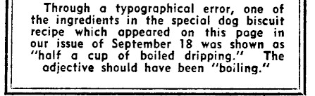 Through a typographical error, one of the ingredients in the special dog biscuit recipe which appeared on this page in our issue of September 18 was shown as "half a cup of boiled dripping." The adjective should have been "boiling."