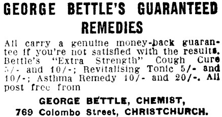 GEORGE BETTLE'S GUARANTEED REMEDIES All carry a genuine money-back guaran- tee 1f you're not satisfled with the results: Bettle's "Extra Strength" Cough Cure 5 / = and 10 / -; Revitalising Tonic 5 / and 10 / Asthma Remedy 10 / and 20/- AlJ post frec from GEORGE BETTLE, chemist, 769 Colombo Streat Christchurch: