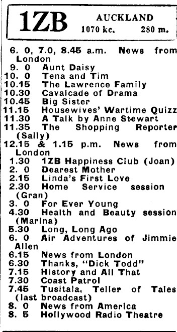 1 ZB AUCKLAND 1070 ke. 280 m. ek ek dk ht 6. 0, 7.0, 8.45 a.m. News from London 5 Aunt Daisy Tena and Tim The Lawrence Family Cavalcade of Drama Big Sister Housewives’ Wartime Quizz A Talk by Anne Stewart The Shopping Reporter aa-c0000 =p eo bos" TOO ws = = a c 3 News’ from 1.30 1ZB Happiness Club (Joan) 2. 0 Dearest Mother 2.15 Linda’s First Love 2.30 Home Service’ session (Gran) 3.0 For Ever Young 4.30 Health and Beauty session (Marina) 5.30 Long, Long Ago 6. O Air Adventures of Jimmie Allen 6.15 News from London 6.30 Thanks, "Dick Todd" 7.15 History and All That 7.30 Coast Patrol 7.45 Tusitala, Teller of Tales (last broadcast) 8. 0 News from America 8. & Hollywood Radio Theatre r ° s Qa ° 3