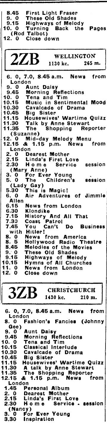 8.45 First Light Fraser 9. 0 These Old Shades 9.15 Highways of Melody 10. 0 Turning Back the Pages (Rod Talbot) 12. 0 Close down 27B WELLINGTON 1130 ke. 265 m. 6. 0, 7.0, 8.45a.m. News from London 9. 0 Aunt Daisy 9.45 Morning ‘ae 10. 0 Tena and T 110.15 Music in MERA Mood 3 Cavaicade of Drama 45 Big Sister -15 Housewives’ Wartime Quizz -30 Talk by Anne Stewart -36 The Shopping Reporter (Suzanne) . 0 Mid-day Melody Menu 15 & 1.15 p.m. News from London 2. 0 Dearest Mother 2.15 Linda’s First Love 2.30 Home Service’ session omery Anne) | 3.0 For Ever ote & 5. 0 The Children at Gay) 5.3 This is Magic! 6. Air Adventures of Jimmie °o as ae ke 6.15 News from London 6.30 Klondike 7.15 History And Ali That 7.39 Coast Patrol 7.45 You Can’t Do Business with Hitler! O News from America 8. 5 Hollywood Radio Theatre 8.45 Melodies of the Movies 9.0 These Old Shades Highways of Melody Hymns of All Churches News from London Close down 3Z7B CHRISTCHURCH 1430 ke. 210 m. 6. 0, 7.0, 8.45a.m. News from London 8. 0 Fashion’s Fancies (Johnny ee 9. 0 ) Aunt Dais 9.45 Morning Reflections 10. 0 Tena and Tim 10.15 Classical interlude 10.30 Cavalcade of Drama 10.45 Big Sister 11.15 Housewives’ Wartime Quizz 11.30 A talk by Anne Stewart 11.35 one Shopping Reporter 12.15 & 1.15 p.m. News’ from London 1.45 Personal Album 2. 0 Dearest Mother 2.15 Linda’s First Love 2.30 Home Service « session Py ae 2 or Ever Young Inspiration as N3S@ °. =o oouag