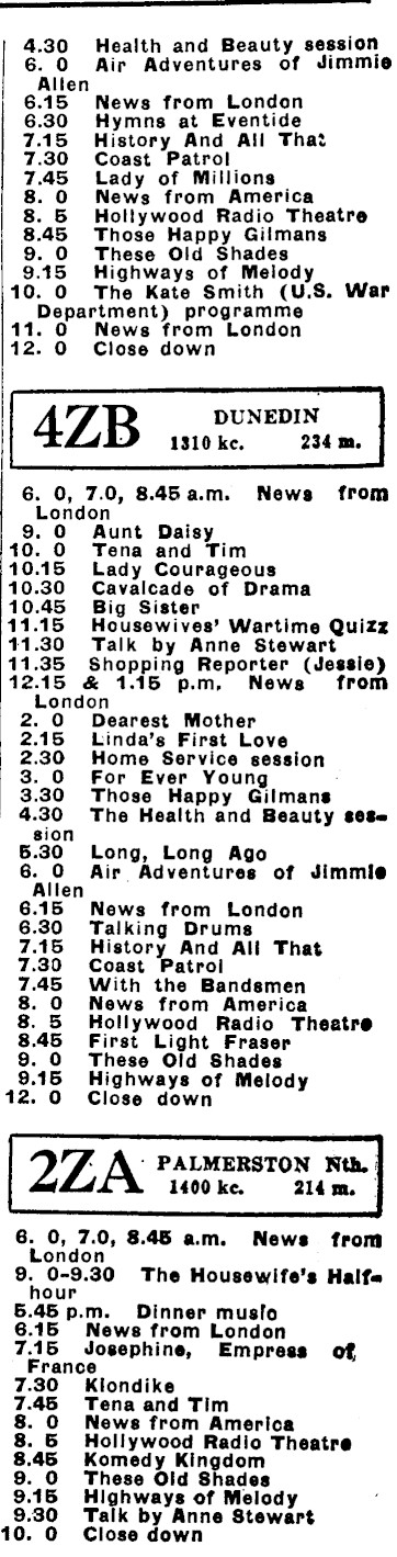 4.30 Health and Beauty session Air Adventures of Jimmie f>) >" s° 3 News from London Hymns at Eventide History And All That Coast Patrol Lady of Millions News from America Hollywood Radio Theatre Those Happy Gilmans These Olid Shades Highways of Melody 10. 0 The Kate Smith (U.S. War Department) programme 11. 0 News from London 12. 0 Close down AZB DUNEDIN 1310 ke. 234m. 6. 0, 7.0, 8.45a.m. News from London 9. 0 Aunt Daisy 10. 0 Tena and Tim 10.15 Lady Courageous 10.30 Cavalcade of Drama 10.45 Big Sister 11.15 Housewives’ Wartime Quizz 11.30 Talk by Anne Stewart 11.35 Shopping Reporter (Jessie) 12.15 & 1.15 p.m, News from London Dearest Mother Linda’s First Love Home Service session For Ever Young : Those Happy Gilmans The Health and Beauty ses SOS LONNNOD bo swo GVogcgdononod =" db _ ao Long, Long Ago Air Adventures of Jimmie OT POONNN 2 ww" w& ecofscooce o | News from London Talking Drums History And All That Coast Patrol With the Bandsmen News from America Hollywood Radio Theatre First Light Fraser These Old Shades Highways of Melody Close down gqogog =" b ouonuo NOOMMBINNDD = yf 9 ‘ PALMERSTON Nth. | 1400 ke, 214m. | 6. 0, 7.0, 8.45 a.m. News from London *. 0-9.30 The Housewife’s Half« our 5.45 p.m. Dinner musloe 6.15 News from London 7.15 Josephine, Empress of France Klondike Tena and Tim News from America Hollywood Radio Theatre Komedy Kingdom These Old Shades en este of Melody Talk by Anne Stewart Close down osnomanons SOCOMMMNIN a