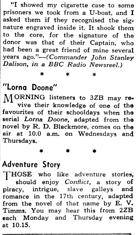 "I showed my cigarette case to some prisoners we took from a U-boat, and I asked them if they recognised the signature engraved inside it. It shook them to the core, for the signature of the donor was that of their Captain, who had been a great friend of mine several years ago."--(Commander John Stanley Dalison, in a BBC Radio Newsreel.) * of Bo "Lorna Doone" ORNING listeners to 3ZB may revive their knowledge of one of the favourites of their schooldays when the serial Lorna Doone, adapted from the novel by R. D. Blackmore, comes on the air at 10.0 am. on Wednesdays and Thursdays. * * * Adventure Story "THOSE who like adventure stories, should enjoy Conflict, a story of ‘piracy, intrigue, slave galleys and romance in the 17th century, adapted from the novel of that name by E, V. Timms. You may hear this from 2ZB each Monday and Thursday evening at 10.15.