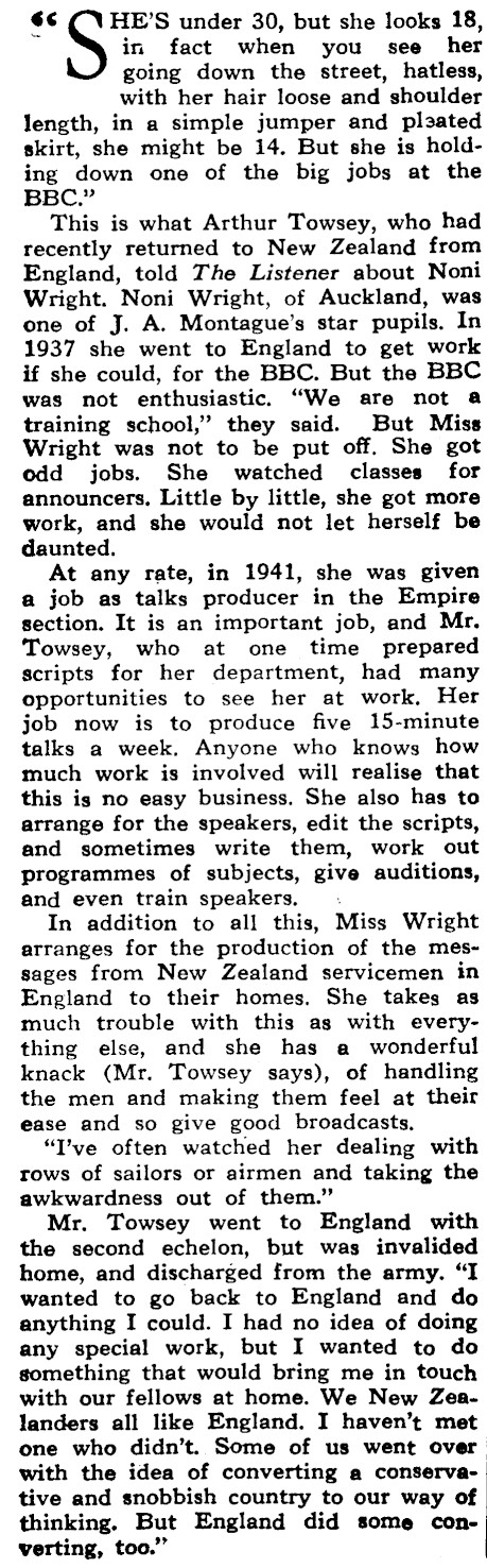 HE’S under 30, but she looks 18, in fact when you see her going down the street, hatless, with her hair loose and shoulder length, in a simple jumper and pleated skirt, she might be 14. But she is holding down one of the big jobs at the BBC." This is what Arthur Towsey, who had recently returned to New Zealand from England, told The Listener about Noni Wright. Noni Wright, of Auckland, was one of J. A. Montague’s star pupils. In 1937 she went to England to get work if she could, for the BBC. But the BBC was not enthusiastic. "We are not a training school," they said. But Miss Wright was not to be put off. She got odd jobs. She watched classes for announcers, Little by little, she got more work, and she would not let herself be daunted. At any rate, in 1941, she was given a job as talks producer in the Empire section. It is an important job, and Mr. Towsey, who at one time prepared scripts for her department, had many opportunities to see her at work, Her job now is to produce five 15-minute talks a week, Anyone who knows how much work is involved will realise that this is no easy business. She also has to arrange for the speakers, edit the scripts, and sometimes write them, work out programmes of subjects, give auditions, and even train speakers. . In addition to all this, Miss Wright arranges for the production of the messages from New Zealand servicemen in England to their homes. She takes as much trouble with this as with everything else, and she has a wonderful knack (Mr. Towsey says), of handling the men and making them feel at their ease and so give good broadcasts, "I’ve often watched her dealing with rows of sailors or airmen and taking the awkwardness out of them." Mr. Towsey went to England with the second echelon, but was invalided home, and discharged from the army. "I wanted to go back to England and do anything I could. I had no idea of doing any special work, but I wanted to do. something that would bring me in touch with our fellows at home. We New Zealanders all like England. I haven’t met one who didn’t. Some of us went over with the idea of converting a conserva- tive and snobbish country to our way of thinking. But England did some converting, too."