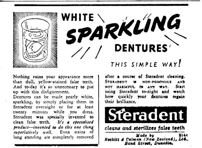 WHITE SpARKLiNG DENTURES / [ | ThiS Simple WAY! Nothing ruins your appearance more after 3 coursc of Steradent cleaning: than dull; yellow-stained false tecth: STERADENT 16 NON-POISONOUS AND And to-day it' $ So unnecessary t0 put NoT HARMFUL IN AnY WaY: Start up with this disfigurement: using Steradent to-night and watch Dentures can be made pearly white; how quickly your dentures regain sparkling, by simply placing them in their brilliance; Steradent overnight Or for at least twenty minutes while you dress: Steradent was specially invented to Steradent clean false tecth; It' $ 4 specialised product _invented to do this onc thing cleans and sterilizes false teeth superlatively well. Even stains of long standing are completely removed Made bv 8t44 Reckitt 4 Colman (Neto Zealand ) , Ltd Bond Street, Dunedina