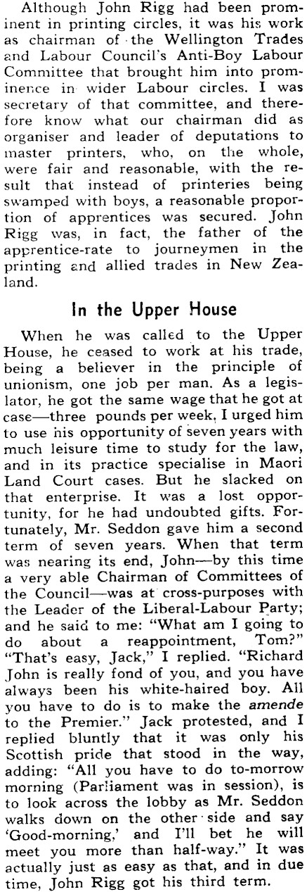 Although John Rigg had been prominent in printing circles, it was his work as chairman of :the Wellington Trades and Labour Council’s Anti-Boy Labour Committee that brought him into prominence in- wider Labour circles. I was secretary of that committee, and therefore know what our chairman did as organiser and leader of deputations to master printers, who, on the whole, were fair and reasonable, with the result that instead of printeries being swamped with boys, a reasonable proportion of apprentices was secured. John Rigg was, in fact, the father of the apprentice-rate to journeymen in the printing and allied trades in New Zealand. In the Upper House When he was called to the Upper House, he ceased to work at his trade, being a believer in the principle of unionism, one job per man. As a legislator, he got the same wage that he got at case-three pounds per week, I urged him to use his opportunity of seven years with much leisure time to study for the law, and in its practice specialise in Maori Land Court cases. But he slacked on that enterprise. It was a lost opportunity, for he had undoubted gifts. Fortunately, Mr. Seddon gave him a second term of seven years. When that term was nearing its end, John-by this time a very able Chairman of Committees of the Council-was at’ cross-purposes with the Leader of the Liberal-Labour Party; and he said to me! "What am I going to do about a reappointment, Tom?" "That’s easy, Jack," I replied. "Richard John is really fond of you, and you have always been his white-haired boy. All you have to do is to make the amende to the Premier." Jack protested, and I replied bluntly that it was only his Scottish pride that stood in the way, adding: "All you have to do to-morrow morning (Parliament was in session), is to look across the lobby as Mr. Seddon walks down on the other:side and say ‘Good-morning,’ and I'll bet he will meet you more than half-way." It was actually just as easy as that, and in due time, John Rigg got his third term.