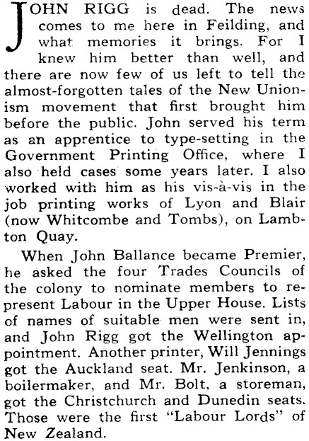 OHN RIGG is dead. The news comes to me here in Feilding, and what memories it brings. For I knew him better than well, and there are now few of us left to tell the almost-forgotten tales of the New Unionism movement that first brought him before the public. John served his term as an apprentice to type-setting in the Government Printing Office, where I also«held cases some years later. I also worked with him as his vis-a-vis in the job printing works of Lyon and. Blair (now Whitcombe and Tombs), on Lambton Quay. When John Ballance became Premier, he asked the four Trades Councils of the colony to nominate members to represent Labour in the Upper House. Lists of names of suitable men were sent in, and John Rigg got the Wellington appointment. Another printer, Will Jennings got the Auckland seat. Mr. Jenkinson, a boilermaker, and Mr. Bolt, a storeman, got the Christchurch and Dunedin seats. Those were the first "Labour Lords" of New Zealand.