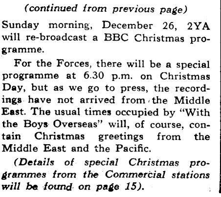 (continued from previous page) Sunday morning, December 26, 2YA will re-broadcast a BBC Christmas programme. For the Forces, there will be a special programme at 6.30 p.m. on Christmas Day, but as we go to press, the recordings. have not arrived from:the Middle East. The usual times occupied by "With the Boys: Overseas" will, of course, contain Christmas greetings from the Middle East and the Pacific. (Details of. special Christmas programmes ' from the Commercial stations will be found..on page 15). ;