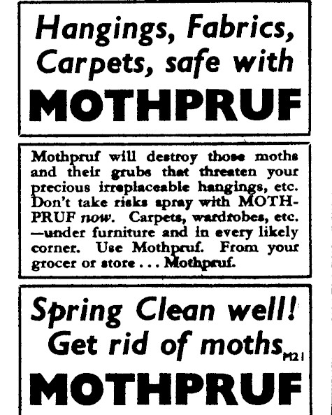 Hangings, Fabrics, Carpets, safe with MOTHPRUF Mothpruf wiu destroy thooe mothe and thefr grubs thet threeten your precious irreplaceable hanging8, etc. Don't take risks epray with MOTH- PRUF now Carpets; wardrobes, etc: ~under furniture and In every likely corner: Use Mothpruf: From your grocer Or 8tore Mothpruf: Spring Clean welll Get rid of mothsji MOTHPRUF