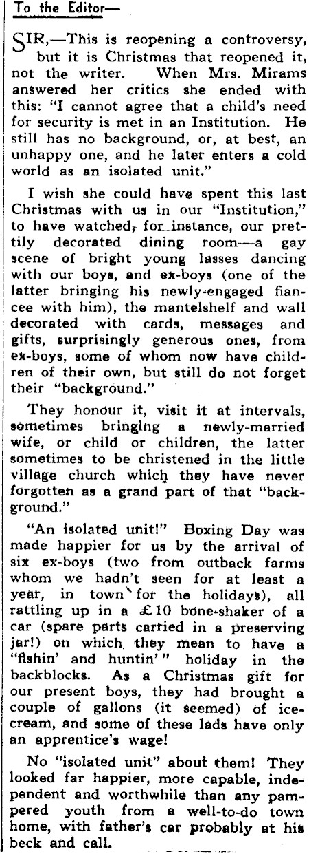 To the Editor-SIR,.-This is reopening a controversy, but it is Christmas that reopened it, not the writer. When Mrs. Mirams answered her critics she ended with this: "I cannot agree that a child’s need for security is met in an Institution. He still has no background, or, at best, an | unhappy one, and he later enters a cold world as an isolated unit." I wish she could have spent this last Christmas with us in our "Institution," to have watched, for_instance, our prettily decoratéd dining toom-a _ gay scene of bright young lasses dancing with our boys, and ex-boys (ote of the latter bringing his newly-engaged fiancee with him), the mantelshelf and wall decorated with cards, messages and gifts, surprisingly generous ones, from ex-boys, some of whom now have children of their own, but still do not forget their "background." — They honour it, visit it at intervals, sometimes bringing a newly-married wife, or child or children, the latter sometimes to be christened in the little village church which they have never forgotten as a grand part of that "background." "An isolated unit!" Boxing Day was made happier for us by the arrival of six ex-boys (two from outback farms whom we hadn’t seen for at least a year, in town*for the holidays), all rattling up in a £10 bone-shaker of a car (spare parts carfied in a preserving jar!) on which they mean to have a "fishin’ and huntin’" holiday in the backblocks. As a Christmas gift for our present boys, they had brought a couple of gallons (it seemed) of icecream, and some of these lads have only an apprentice’s wage! No "isolated unit" about them! They looked far happier, more capable, independent and worthwhile than any pampered youth from a well-to-do town home, with father’s car probably at his beck and call.